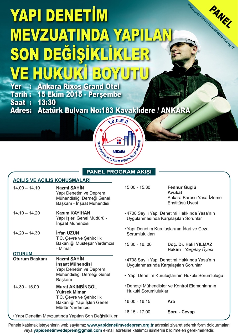 Yapı Denetim ve Deprem Mühendisliği Derneği olarak 30 Nisan 2025 Çarşamba / 9:30 – 16:30 / İnşaat Mühendisleri Odası Necatibey Caddesi No:57 Çankaya/Ankara adresinde düzenleyeceğimiz “Doğal Afetlerde ve Yapı Denetim Hizmetlerinde Mühendis ve Mimarların Hukuki ve Cezai Sorumlulukları” sempozyumunda ülkemizde şehirleşme ile gerçekleşen Yapı Denetimi sürecindeki mesleki sorumluluk, imar ve şehircilik sorunları , doğal afetler sonrası yaşanan hukuki süreçler, iş ve sosyal güvenlik hukuku konuları ; T.C. Yargıtay Başkanlığı, T.C. Çevre, Şehircilik ve İklim Değişikliği Bakanlığı, Üniversite Hukuk Fakülteleri Öğretim Üyeleri, Meslek Kuruluşlarının uzman konuşmacıları tarafından değerlendirilecektir. Konular özelindeki sunum ve değerlendirmelerin Yapı Denetim sektörüne katkı sunması hedeflenmektedir. Katılımın herkese […]